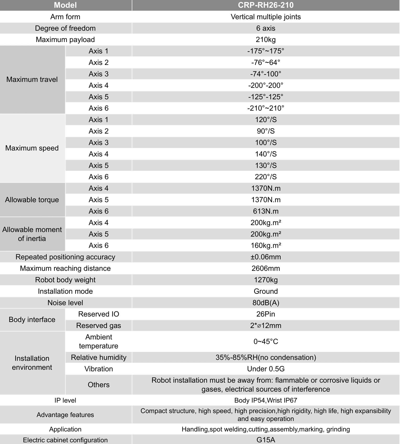 Experience unparalleled precision and stability with the CRP-RH26-210 industrial robot. Featuring a massive 2.6-meter reach (Arm Span) and a heavy-duty 210 kg payload, this robot is built for superior performance in complex welding and transportation tasks. Its innovative hollow arm structure and integrated wrist cabling minimize interference and guarantee stable operation. Equipped with a high-speed servo motor, high-precision RV reducer, and the latest anti-vibration control, it significantly shortens cycle times and ensures high-density installation, allowing multiple units to work seamlessly together. Get maximum performance with minimum footprint.