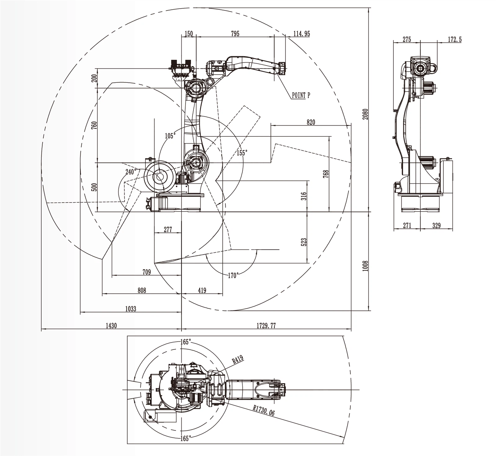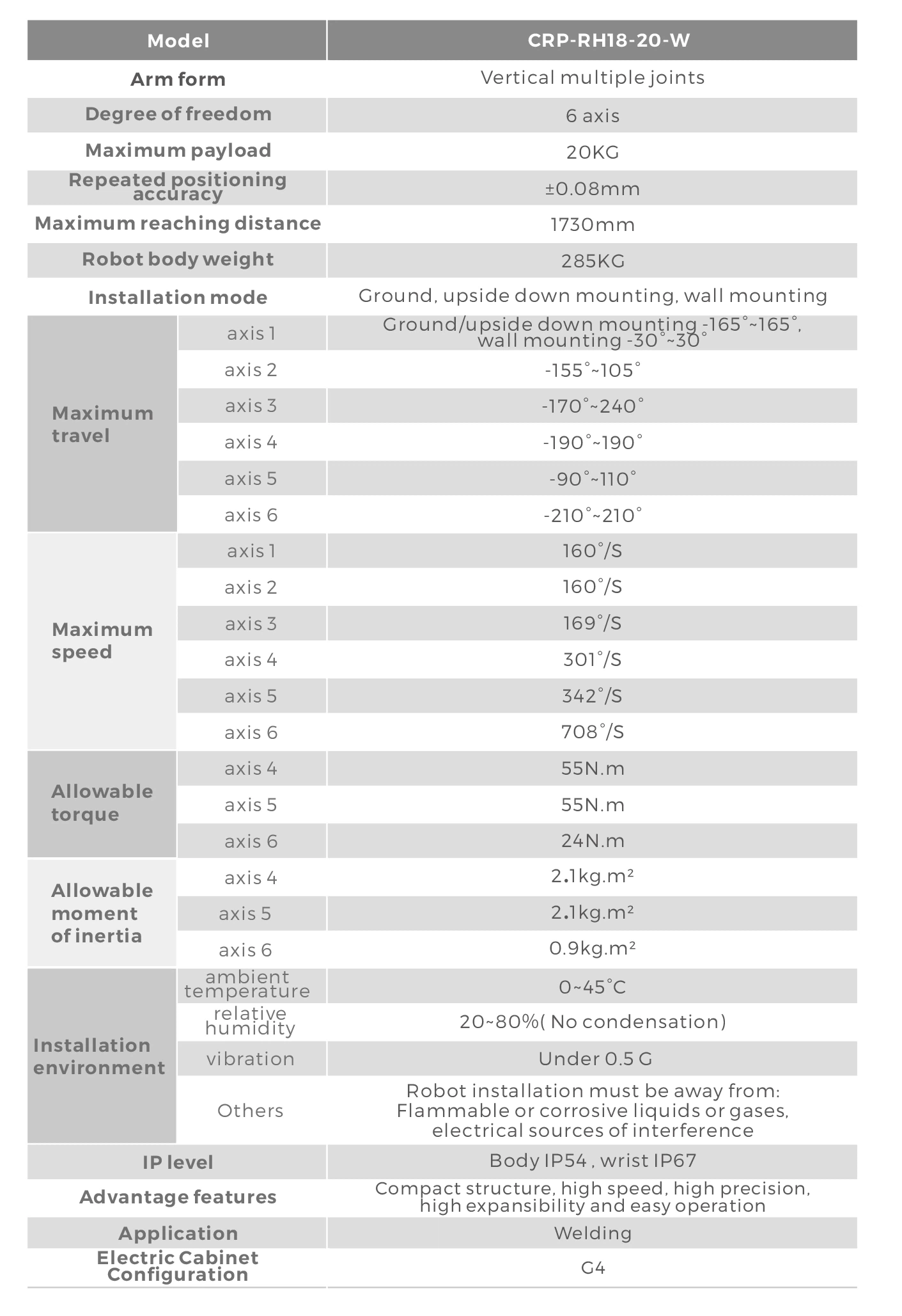 FUNCTIONAL FEATURES: · The arm span is nearly 1.8 meters. The design is highly compact and can be flexibly installed on the ground or upside down. · With large working space, fast running speed and high repeated positioning accuracy, it is suitable for wide range of welding applications. · The safety emergency stop board independent of the control system is equipped with, and the safety relay circuit is adopted to provide double-circuit emergency stop to ensure the reliability of emergency stop. · The robot body adopts highly flexible special cable. · Built-in three-phase transformer makes 380V and 220V isolated to help the power supply more stable. Built-in three-phase filter can effectively improve the performance of EMC and EMI. · The robot body is with dual-circuit gas pipe to meet the welding demand. · The inner diameter of 6-axis middle hole is 44mm, it can meet the installation requirements of water-cooling torch and bellows torch. · Highly flexible welding cable is built-in.
