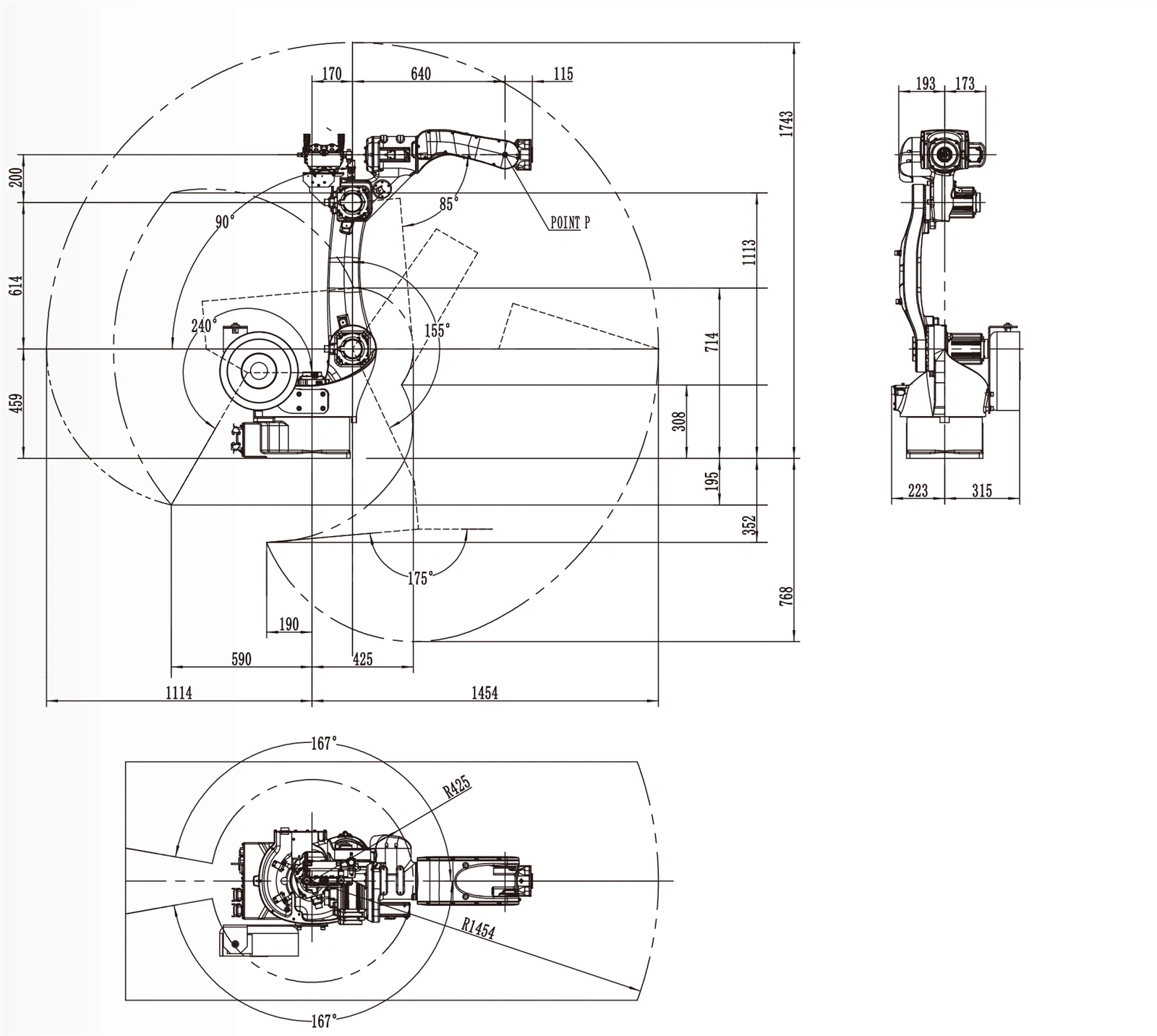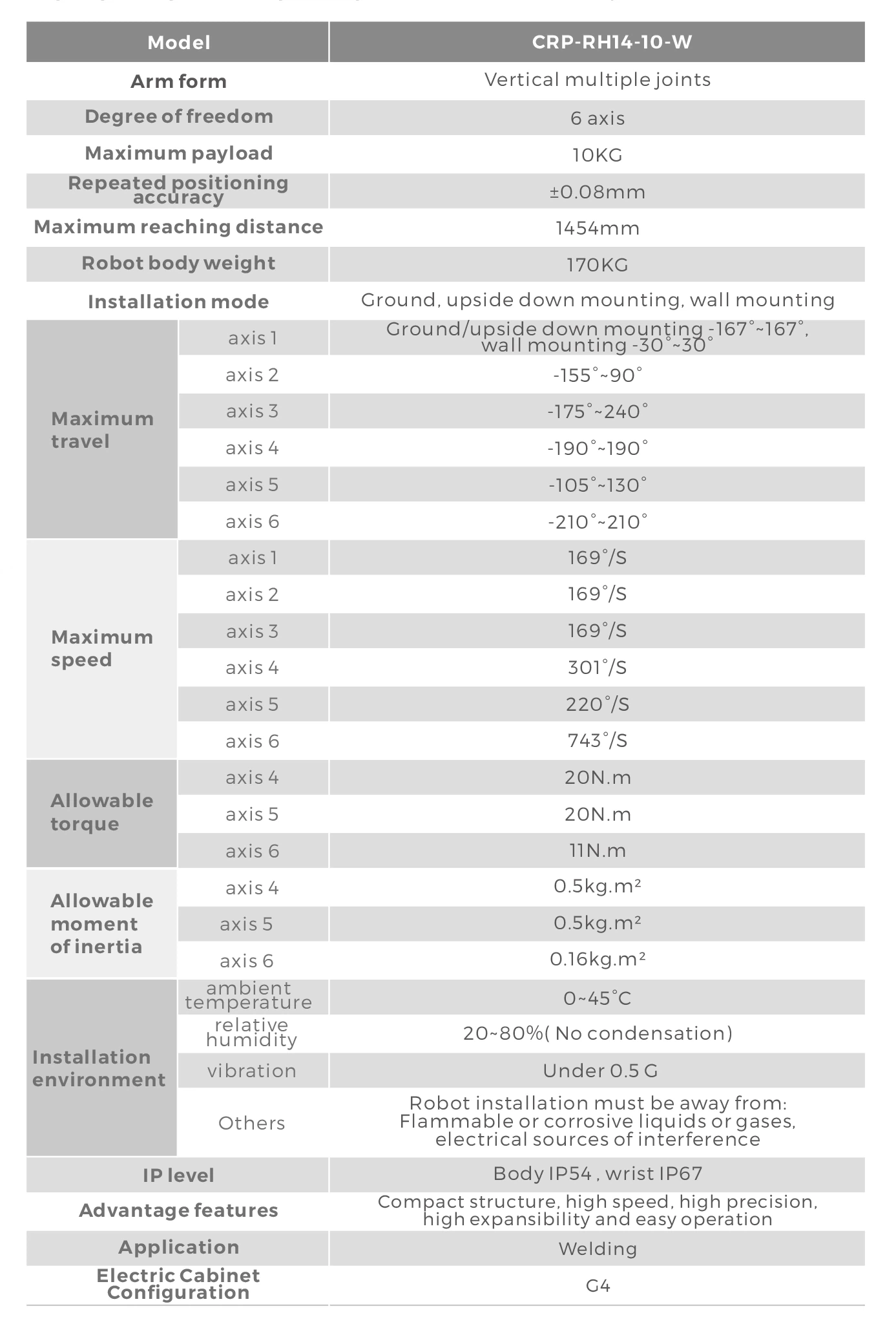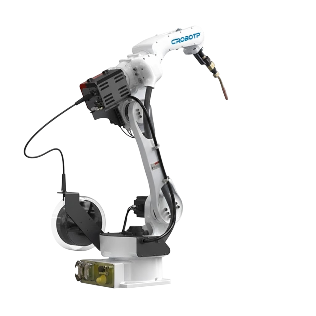 FUNCTIONAL FEATURES The arm span is nearly 1.8 meters. The design is highly compact and can be flexibly installed on the ground or upside down. With large working space, fast running speed and high repeated positioning accuracy, it is suitable for wide range of welding applications. The safety emergency stop board independent of the control system is equipped with, and the safety relay circuit is adopted to provide double-circuit emergency stop to ensure the reliability of emergency stop. The robot body adopts highly flexible special cable. Built-in three-phase transformer makes 380V and 220V isolated to help the power supply more stable. Built-in three-phase filter can effectively improve the performance of EMC and EMI. The robot body is with dual-circuit gas pipe to meet the welding demand. The inner diameter of 6-axis middle hole is 44mm, it can meet the installation requirements of water-cooling torch and bellows torch. Highly flexible welding cable is built-in.