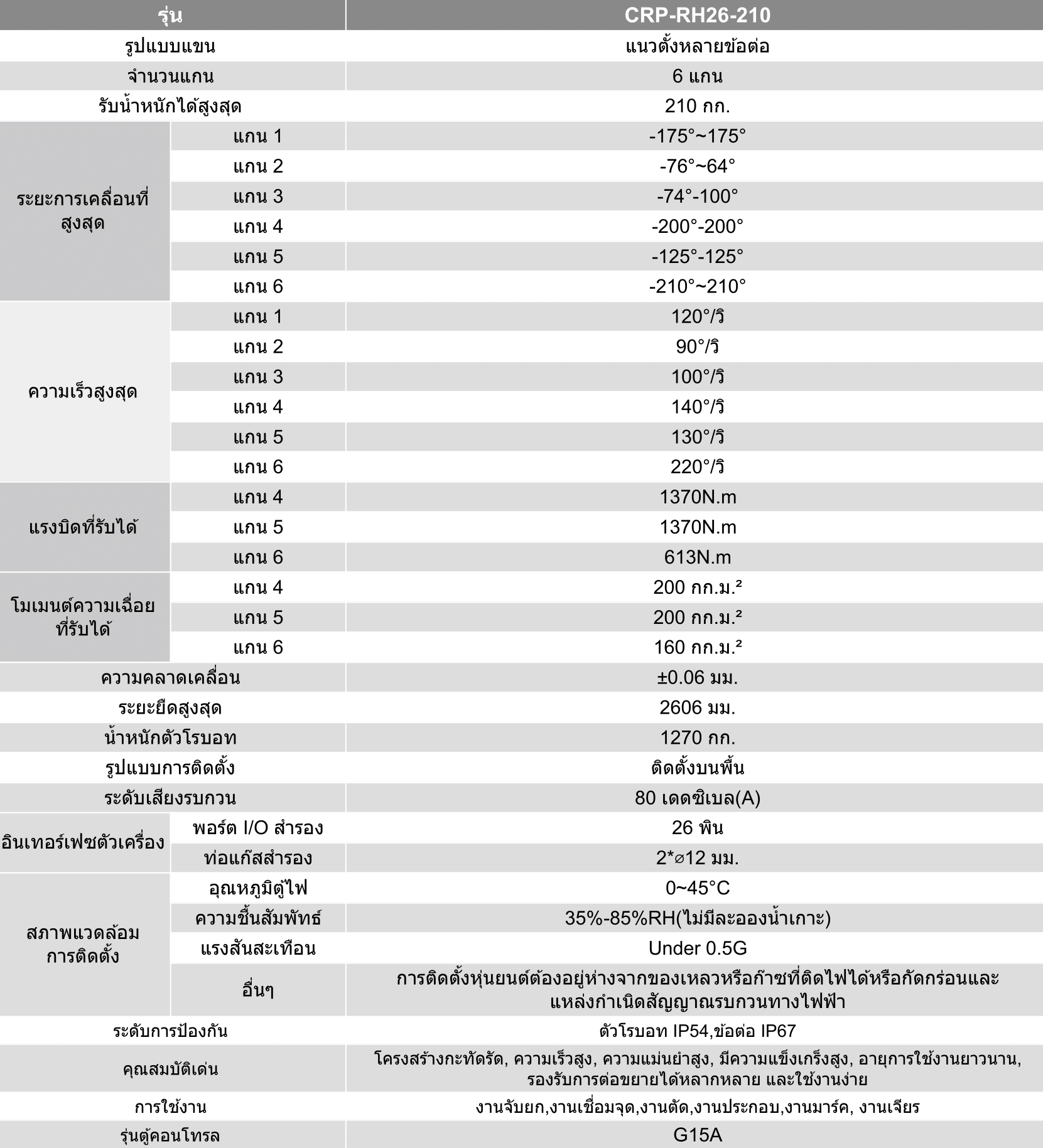 ยกระดับสายการผลิตของคุณสู่ความล้ำสมัยด้วย CRP-RH26-210 หุ่นยนต์อัจฉริยะที่รวมพลังขับเคลื่อนระดับ 210 กิโลกรัมเข้ากับแขนกลยาวพิเศษ 2.6 เมตร เพื่อตอบโจทย์งานหนักและงานละเอียดในหนึ่งเดียว ไม่ว่าจะเป็นงานเชื่อมหรือการลำเลียงวัตถุขนาดใหญ่ ด้วยการออกแบบแขนกลที่ซ่อนสายเคเบิลไว้ภายในอย่างมิดชิด ทำให้เครื่องทำงานได้อย่างเสถียรและทนทาน มอบความรวดเร็วที่เหนือกว่าด้วยมอเตอร์กำลังสูงและเทคโนโลยีลดแรงสั่นสะเทือนที่ช่วยให้งานเสร็จไวและแม่นยำยิ่งขึ้น อีกทั้งยังถูกออกแบบมาโดยคำนึงถึงการประหยัดพื้นที่ติดตั้ง ทำให้คุณสามารถจัดวางหุ่นยนต์หลายยูนิตให้ทำงานร่วมกันได้อย่างมีประสิทธิภาพสูงสุด ช่วยเพิ่มกำลังการผลิตและสร้างความได้เปรียบทางการแข่งขันให้ธุรกิจของคุณได้อย่างยั่งยืน